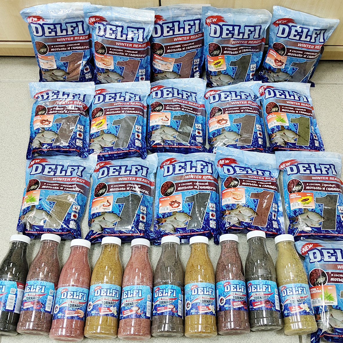 Лещ+Плотва (аромат подсолнух) Лещ+Плотва (аромат конопля) Река (аромат червь+мотыль) Карась (мотыль+червь) Универсальный (аромат гаммарус+мотыль) Универсальный (аромат креветка)