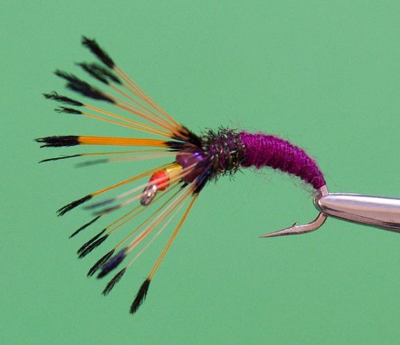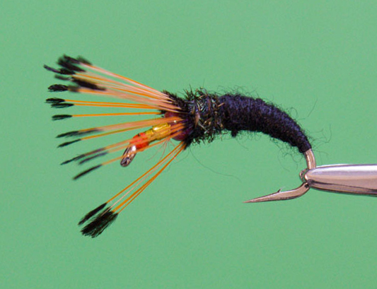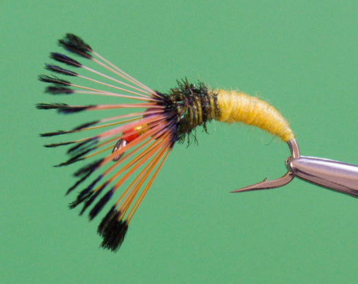 Крючок: Hayabusa № 12 Головка: нить UNI thread, плоский люрекс Монтажная нить: Dortak Тело:нить Dortak, бисер иридисцентный Торакс: бородка пера павлина Ершик: шейное перо золотого фазана |